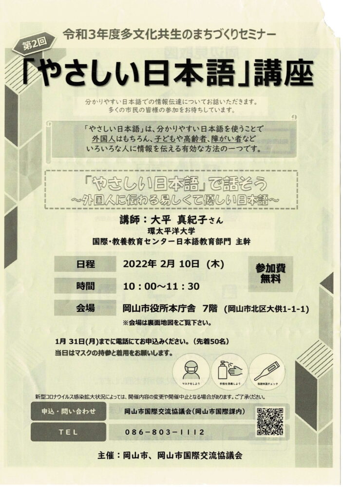 TOP/新着情報/お知らせ/やさしい日本語講座→3月に延期になりました。