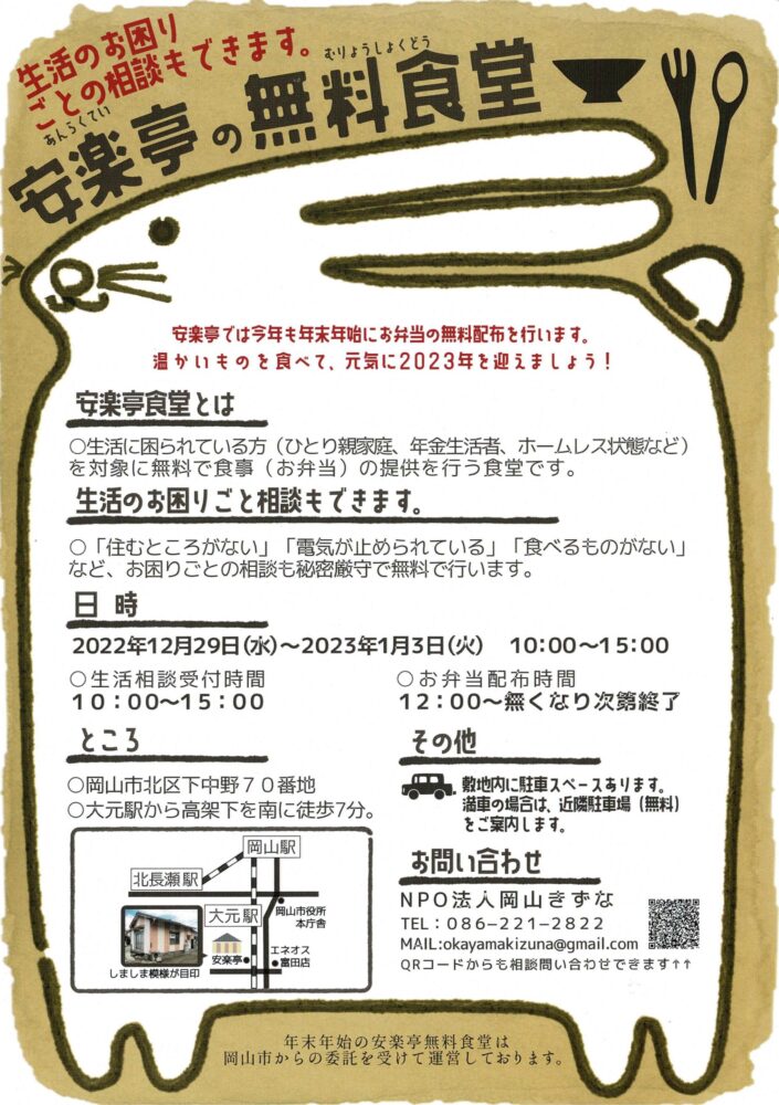 TOP/新着情報/お知らせ/NPO法人岡山きずな 年始年末無料食堂